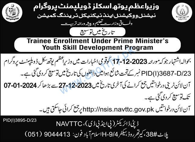 The Free Training has been announced by the National Vocational and Technical Training Commission all over Pakistan. The Advertisement is published in the Express Newspaper dated 25-12-2023.