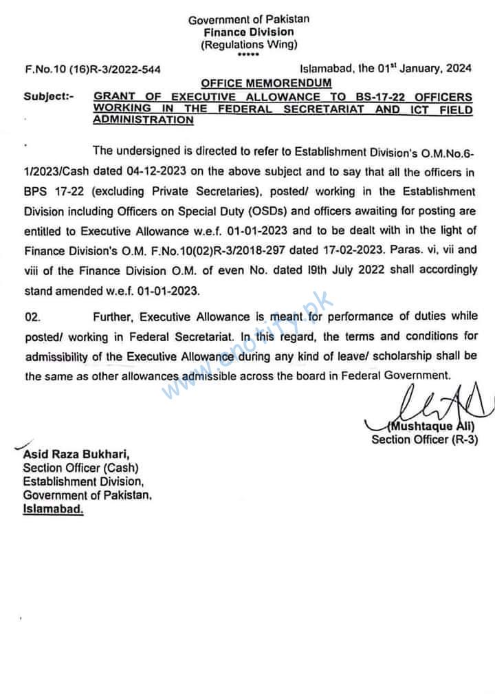 The Finance Division issued an office memorandum on 01-01-2024 regarding the Executive Allowance for the officers in BPS 17-22 posted in the Establishment Division including officers on Special Duty and officers awaiting for posting with effect from 01.01.2023.