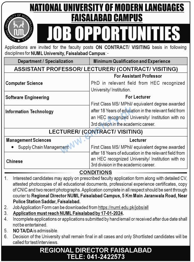 Teaching Jobs in NUML University Faisalabad Campus announced in Express Newspaper dated 04-01-2024. The National University of Modern Languages invited applications for the faculty posts on a contract / visiting basis. All posts are available at NUML University Faisalabad Campus.