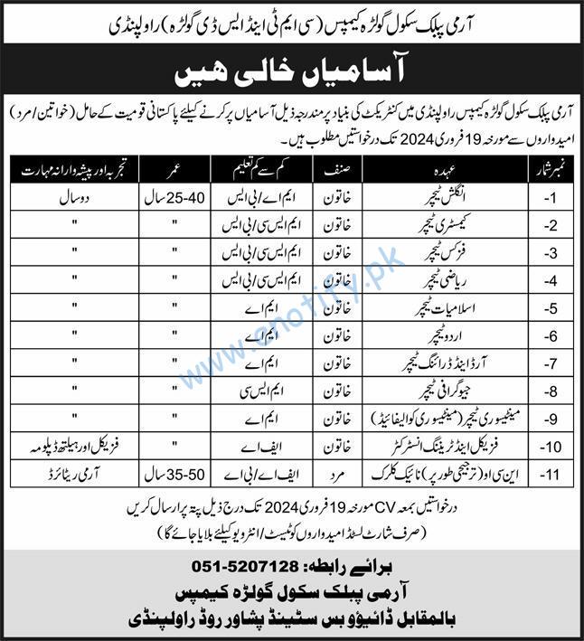 Army Public School Jobs at Golra Campus Rawalpindi announced in Express Newspaper dated 21-01-2024. The Army Public School announced Teaching and Clerical opportunities at Golra Campus. The posts are on a contract basis.