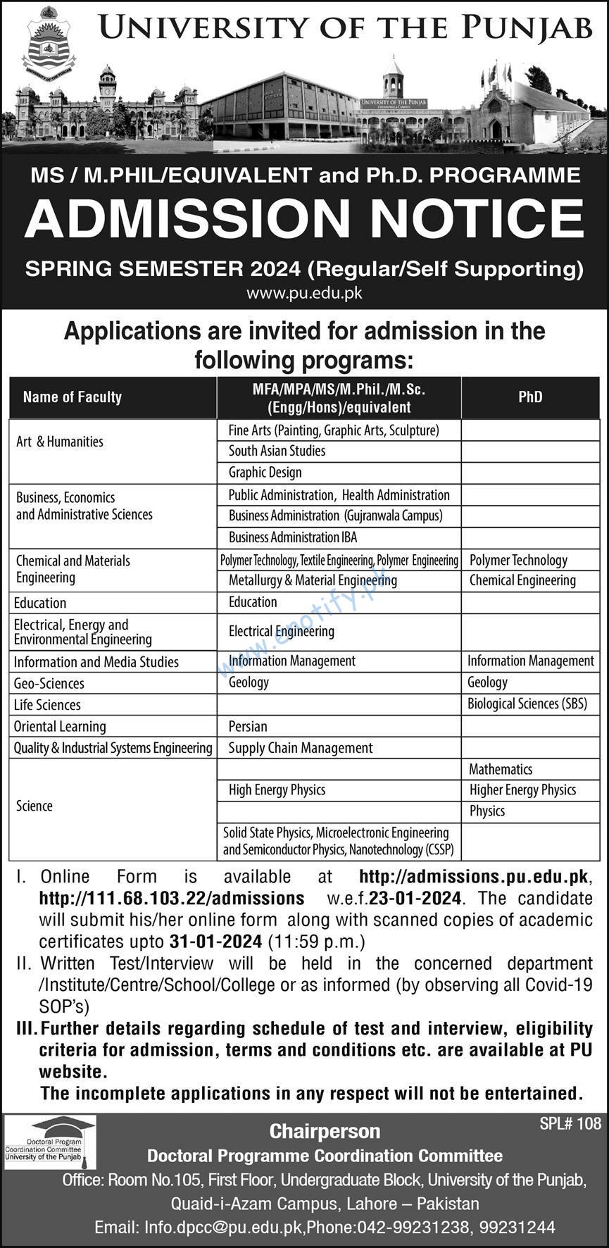 The MS MPhil PhD Admissions 2024 invited by the Punjab University for the following programs:-