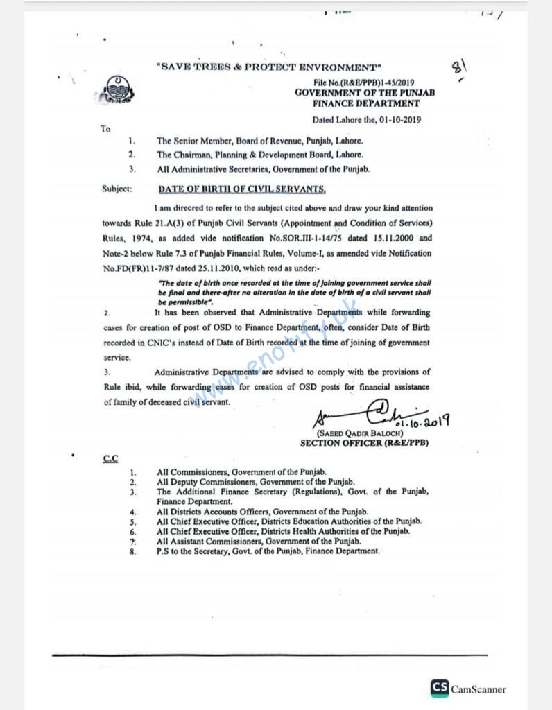 Civil Servants Date of Birth Guideline 2019 of Punjab Govt issued vide File No (R&B/PPB)1-45/2019 dated 01-10-2029.