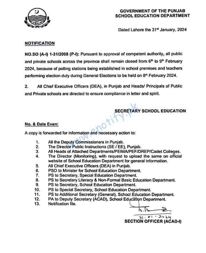 School Closing Notification 31-01-2024 of Punjab Education Department on Election 2024 vide No. SO(A-I)1-31/2008(P-I) dated 31st January 2024. The Punjab School Education Department decided to close the public and private schools from 06th to 09th February 2024 due to Election 2024. The decision is due to the Election as fixed on 08-02-2024 and schools are declared as polling stations. The teachers are also performing election duties and responsibilities.