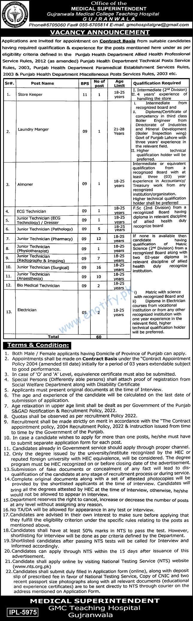Gujranwala Medical College GMC Teaching Hospital Jobs in Gujranwala announced in Express Newspaper dated 24-04-2024. The GMC Teaching Hospital invited applications for appointment on Contract Basis from suitable candidates having the required qualifications and experience for the posts mentioned here as per eligibility criteria defined in the Punjab Health Department Technical Posts Services Rules, 2023, Punjab Health Department Paramedical Establishment Services Rules, 2023 and Punjab Health Department Miscellaneous Posts Services Rules, 2023, etc.
