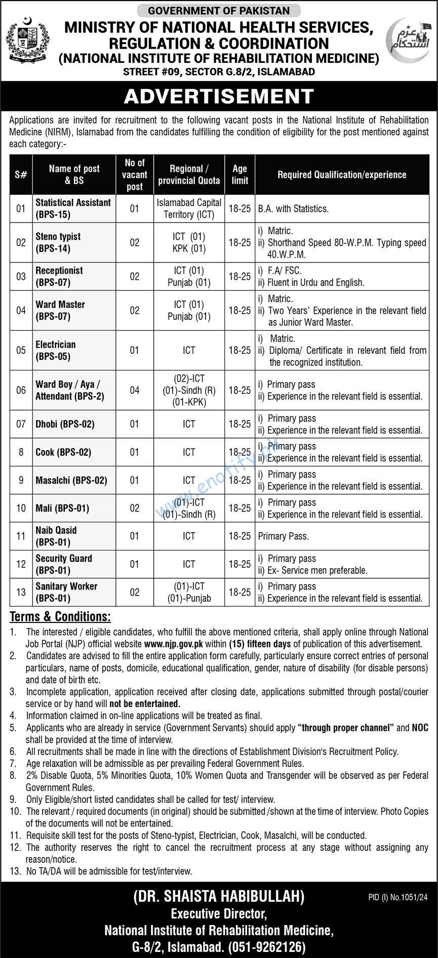 Applications are invited for recruitment to the following vacant posts in the National Institute of Rehabilitation Medicine (NIRM), Islamabad for the candidates fulfilling the condition of eligibility for the post mentioned against each category: