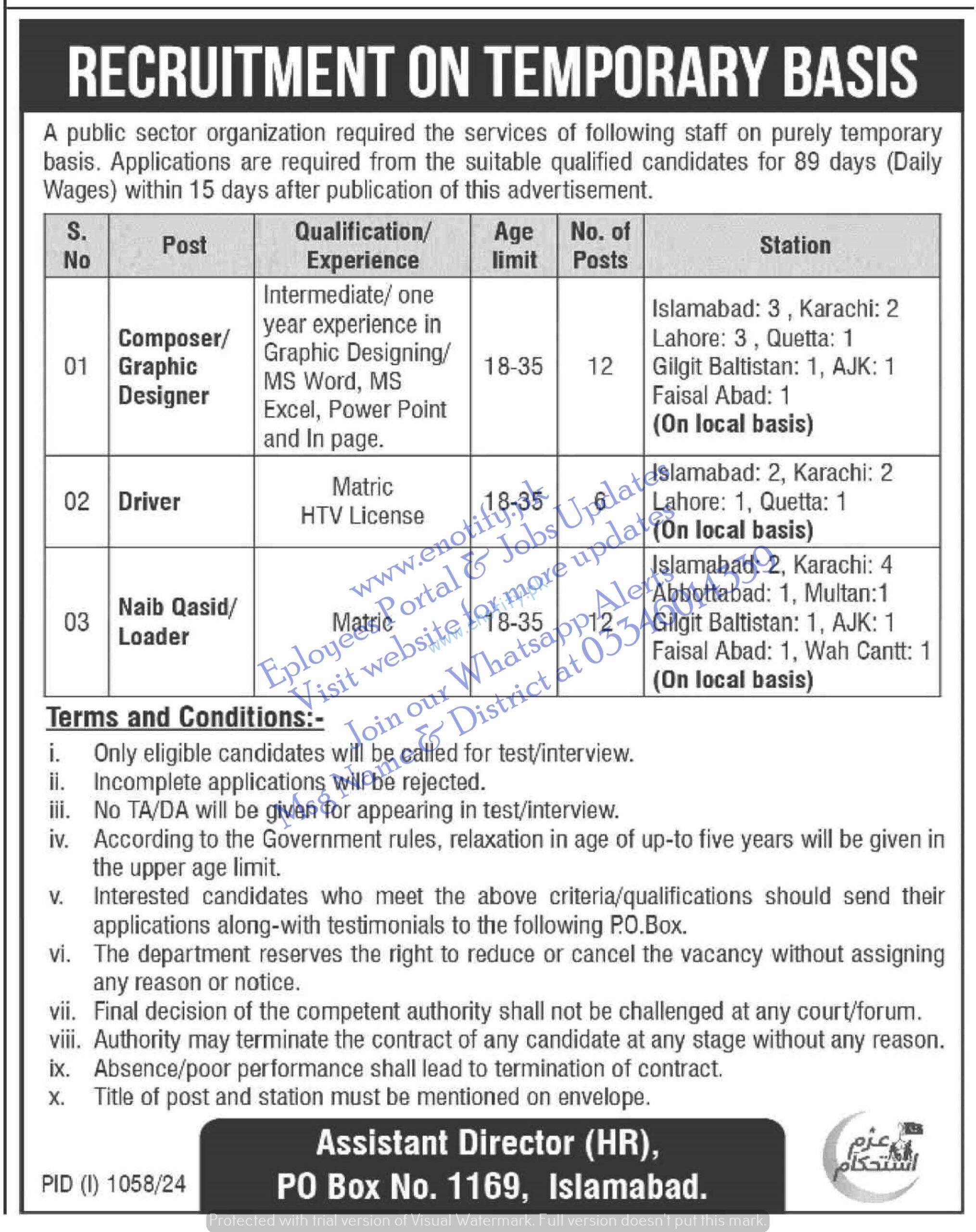 3 | Naib Qasid / Loader | 12 | Islamabad: 2, Karachi: 4, Abbottabad: 1, Multan: 1, Gilgit Baltistan: 1, AJK: 1, Faisalabad: 1, Wah Cantt: 1 (On a local basis) |