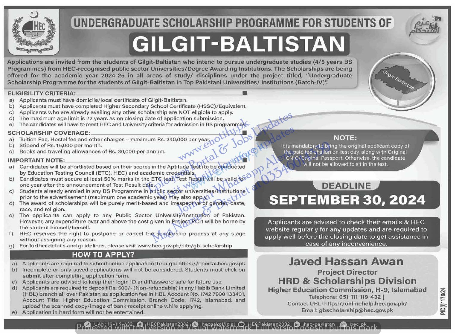 The applications are invited from the students of Gilgit-Baltistn who intend to pursue undergraduate studies (4/5 years BS Programmes) from HEC-recognized public sector Universities / Degree Awarding Institutions. The Scholarships are being offered for the academic year 2024-2025 in all areas of study/discipline under the project titled “Undergraduate Scholarship Programme for the Students of Gilgit Baltistan in Top Pakistani Universities / Institutions (Batch-IV)”.