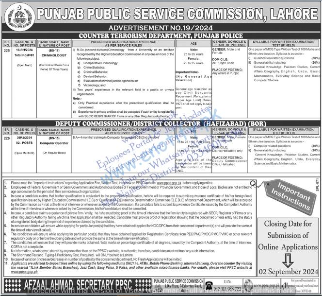 Latest Advertisement of PPSC Jobs Adv No 19-2024