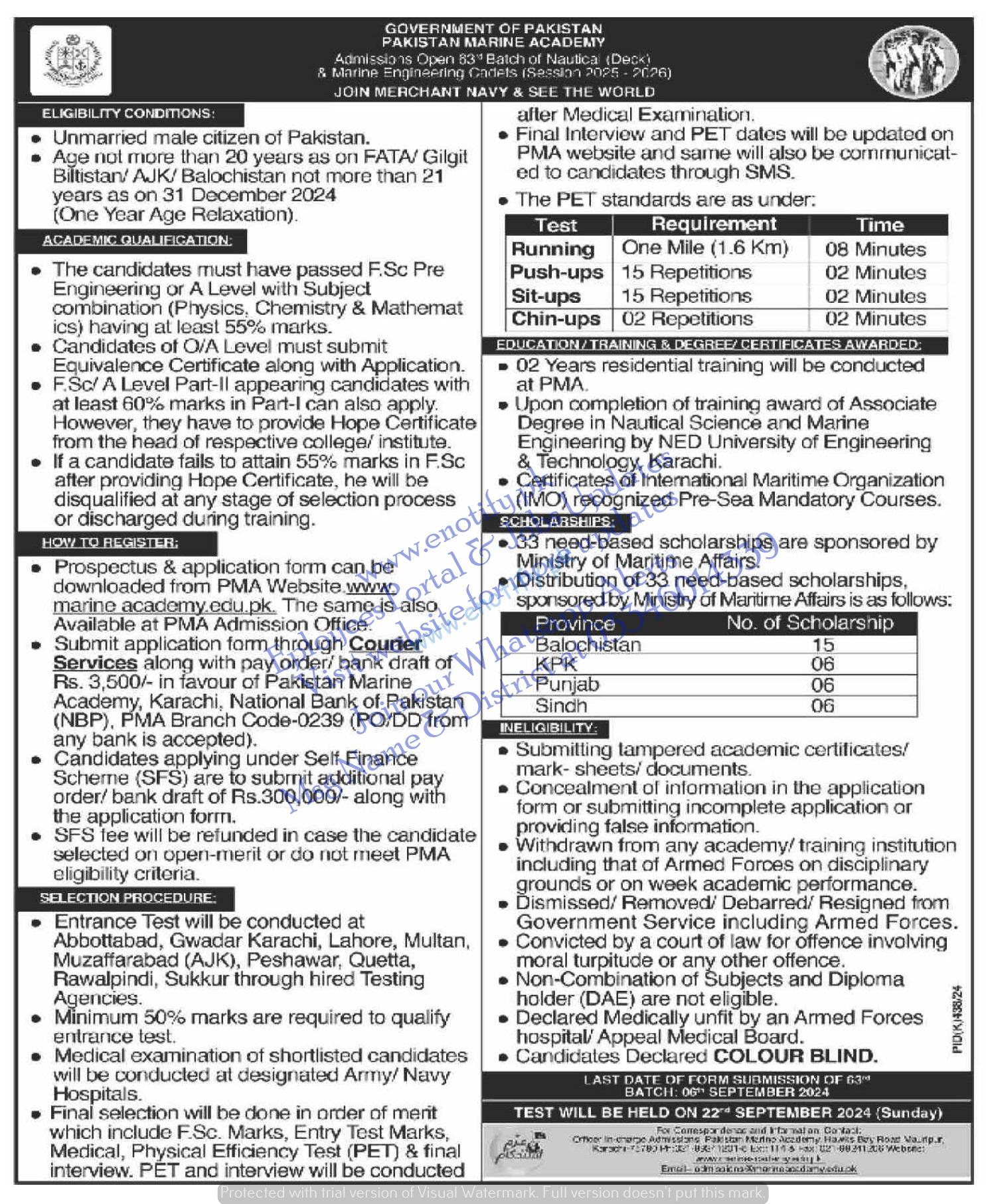 - The prospectus and application form can be downloaded from the PMA website www.marine.academy.edu.pk. The same is also available at the PMA Admission office.