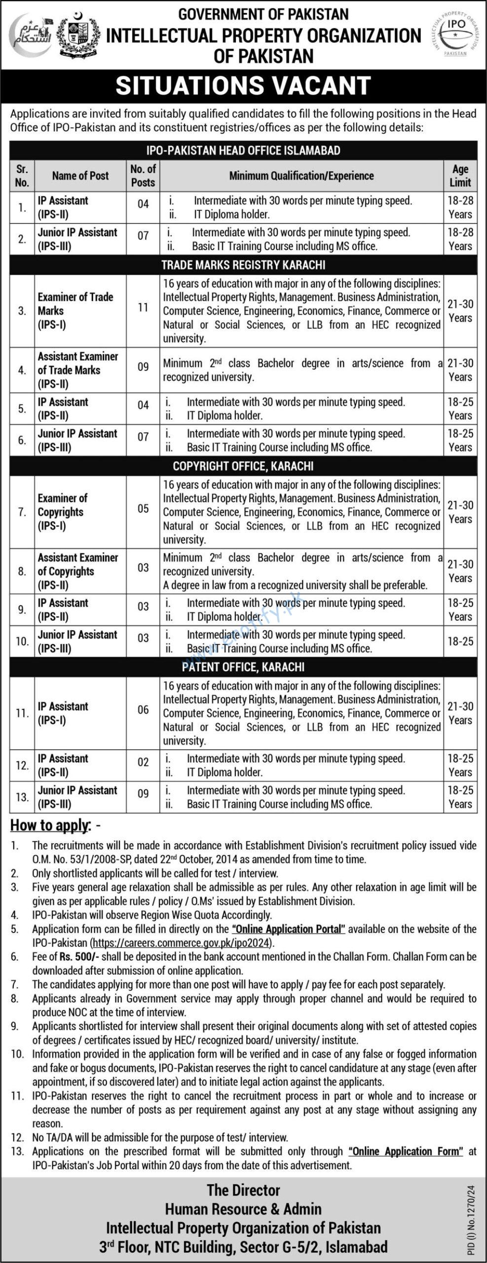 • Application in the prescribed format will be submitted only through the Online Application Form at the IPO Pakistan job Portal within 20 days from the date of this advertisement. (The last date may be 10-09-2024).