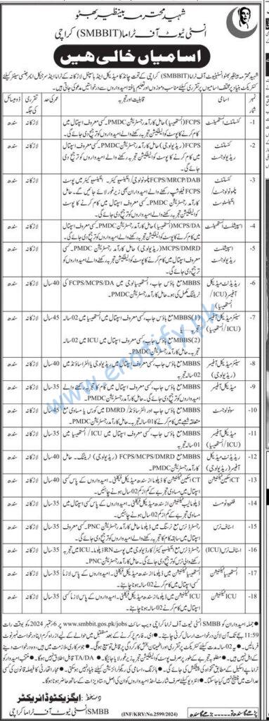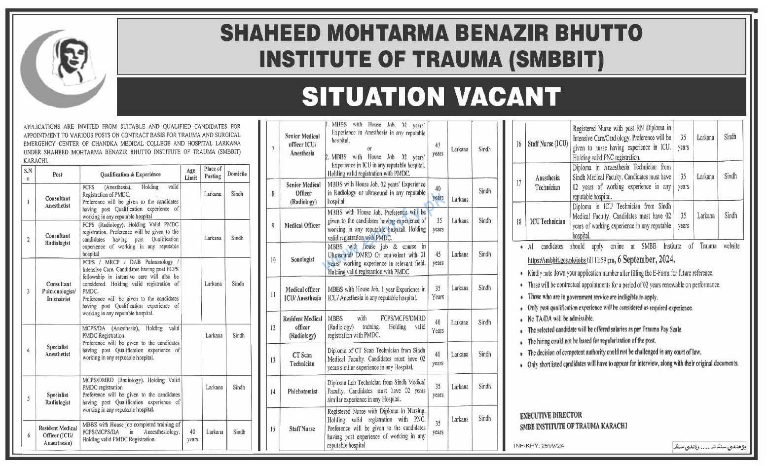 Shaheed Mohtarma Benazir Bhutto Institute of Trauma (SMBBIT) Jobs in Larkana Sindh announced in Dawn Newspaper dated 21-08-2024. The Shaheed Mohtarma Beanazir Butto Institute of Tarama SMBBIT invited applications from suitable candidates for the vacant posts on a contract basis for TRAUMA and Surgical Center of Chandka Medical College and Hospital Larkana.