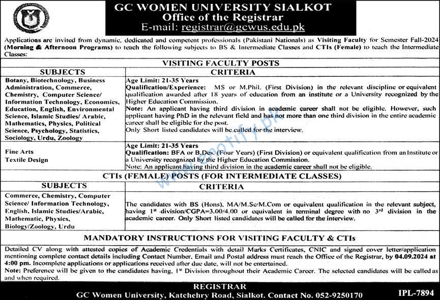 Teaching Jobs in GC Women University Sialkot announced in Express Newspaper dated 21-08-2024. The applications are invited for visiting faculty and CTIs Females.