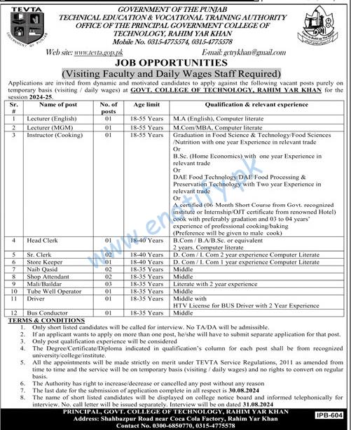 Visiting Teaching Faculty and Staff Jobs in Govt College of Technology Rahim Yar Khan announced in Jang Newspaper dated 20-08-2024. The applications are invited for visiting and daily-wages basis in the institute.