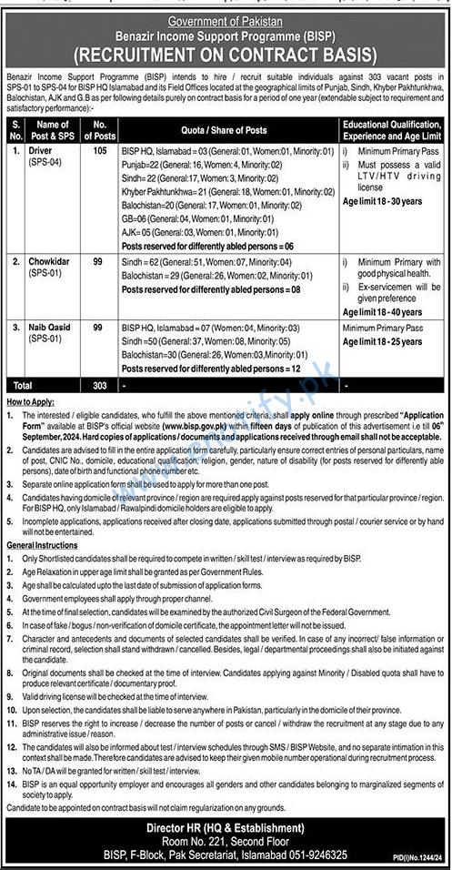 Benazir Income Support Programme BISP intends to hire/recruit suitable individuals against 303 vacant posts in SPS-01 to SPS-04 for BISP HQ Islamabad and its Field Offices located at the geographical limits of Punjab, Sindh, Khyber Pakhtunkhwa, Balochistan, AJK and G.B as per following details purely on contract basis for one year (extendable subject to requirement and satisfactory performance):
