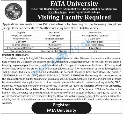 - Attested copies of all documents along with CV and photographs must reach the Registrar, Office FATA University, Tribal Sub Division, Darra Adam Khel, District Kohat on or before 3rd September 2024 via courier or by hand.