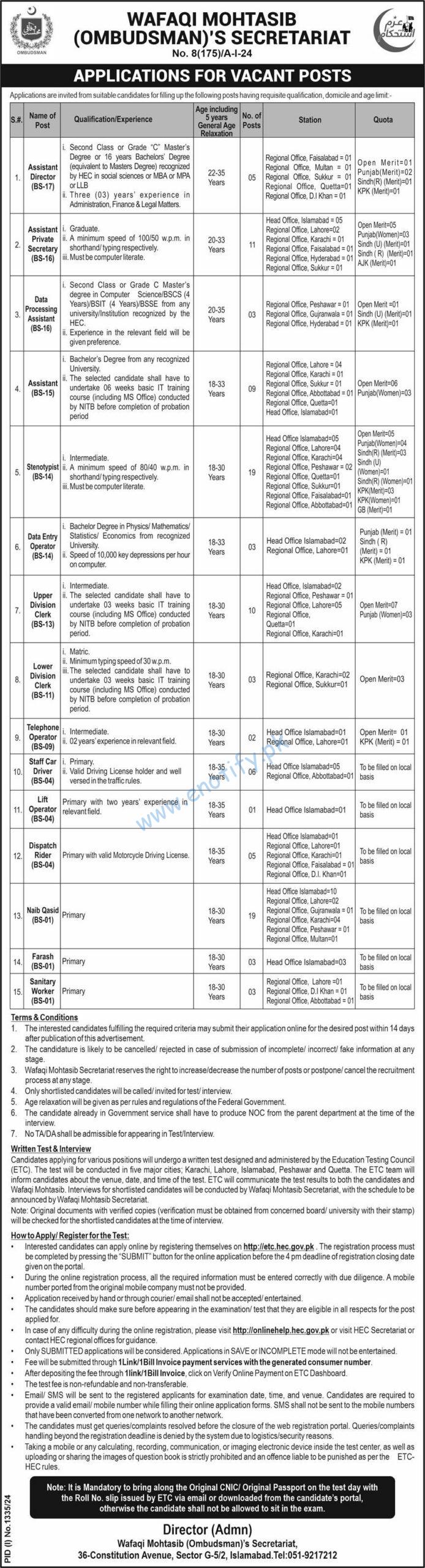 Latest Advertisement of Wafaqi Mohtasib Jobs