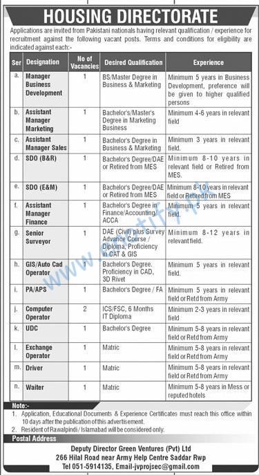 - Send your application, educational documents, and experience certificates to the Deputy Director Green Ventures (Pvt) Ltd, 266 Hilal Road near Army Help Centre Saddar Rwp,