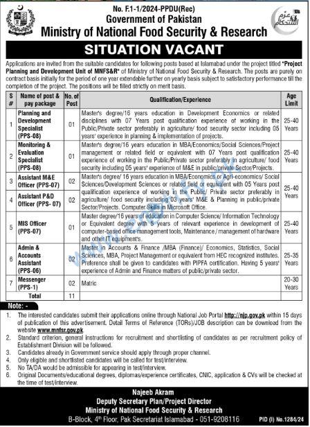 Ministry of National Food Security and Research MNFSR Jobs in Pakistan