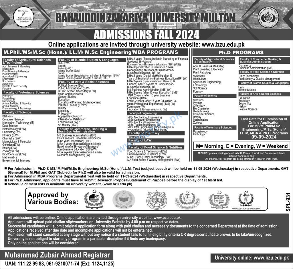 Bahauddin Zakariya University BZU Multan Admissions Fall 2024 announced in Express Newspaper dated 28-08-2024. The BZU University announced Admissions for 2024 and invited online applications.
