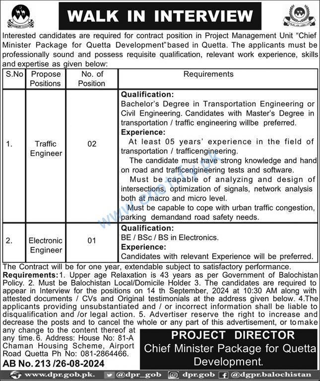 Project Management Unit Jobs in CM Package for Quetta Development was announced in Express Newspaper dated 28-08-2024. Applications are invited for the project in Quetta.