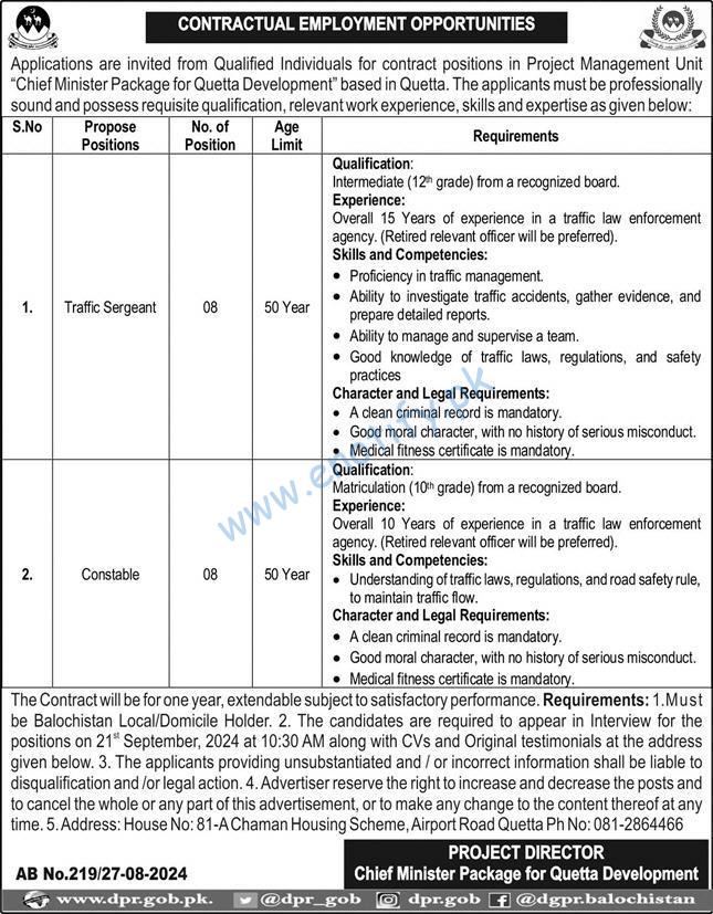 Traffic Sergeant and Constable Jobs in CM Package for Quetta Development Project Balochistan