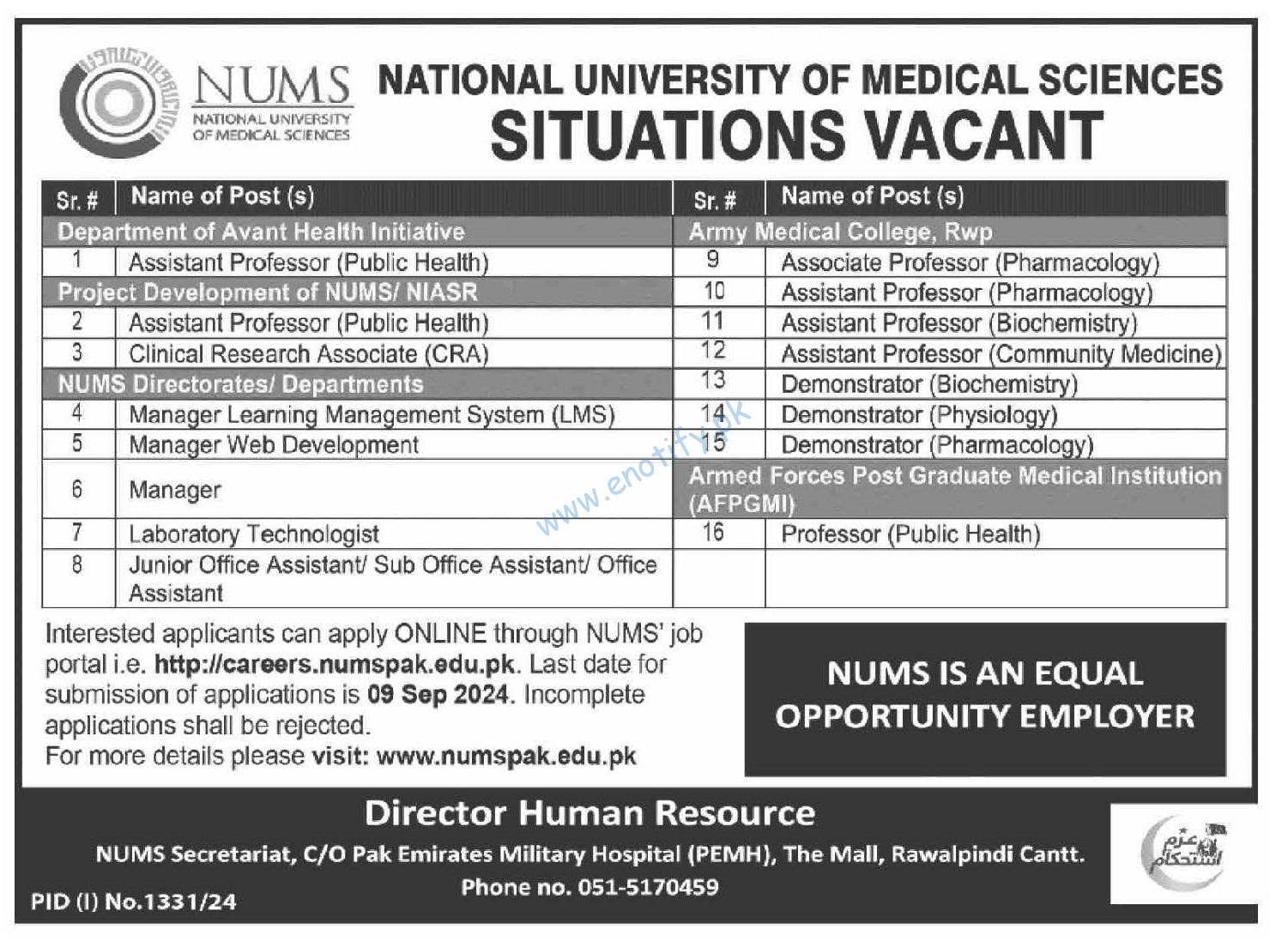 Teaching and Non-Teaching Jobs in NUMS National University of Medical Sciences announced in Express Newspaper dated 25-08-2024. The applications are invited online at the NUMS jobs portal.