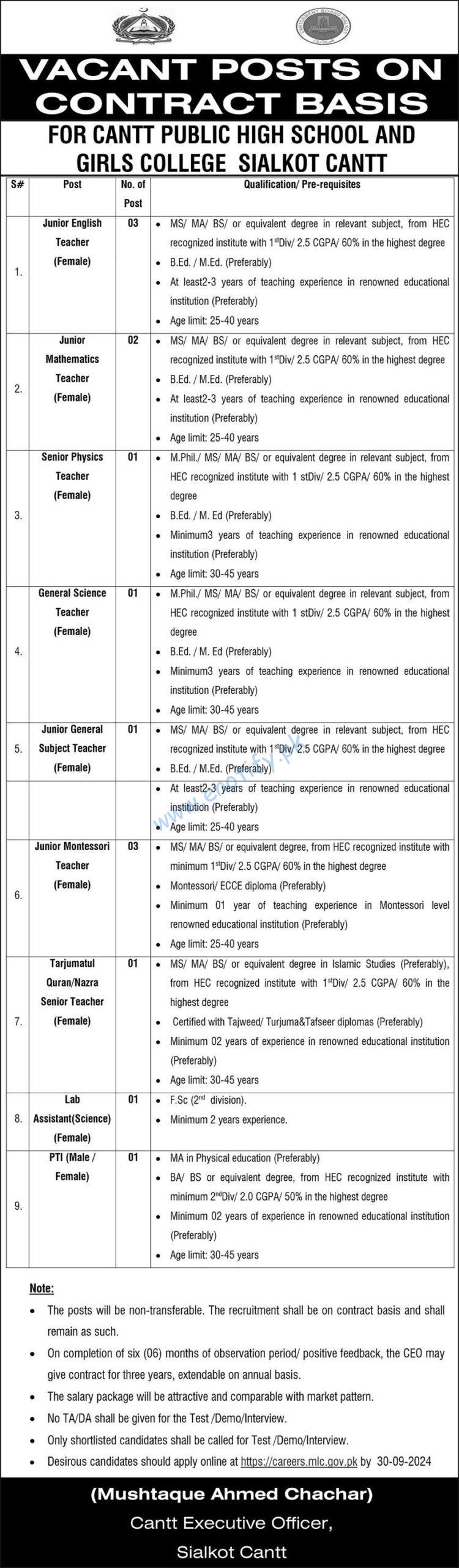 Applications are invited for the following posts for Cantt Public High School and Girls College College Sialkot Cantt: