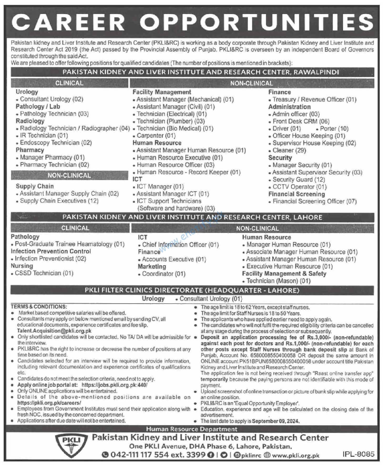 Pakistan Kidney and Liver Institute and Research Center PKLI Jobs in Pakistan were announced in Dawn Newspaper dated 28-08-2024. Applications are invited for different vacant posts.