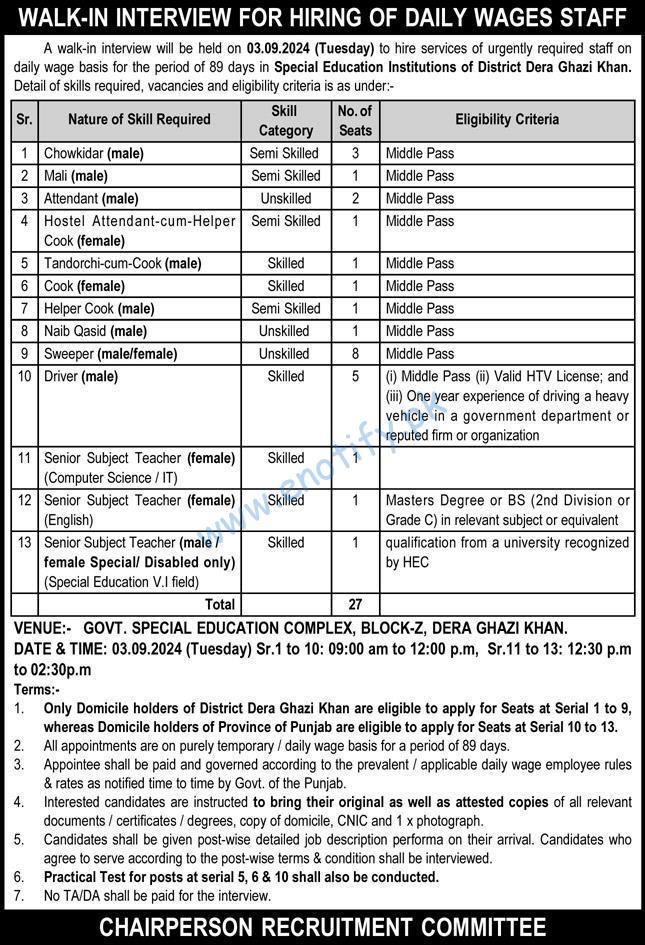 - Venue for Interview: Govt Special Education Complex, Block-Z, Dera Ghazi Khan.
