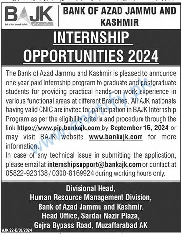 The Bank of Azad Jammu and Kashmir is pleased to announce a year-paid Internship Program for graduate and postgraduate students to provide practical hands-on work experience in various functional areas at different Branches. All the Nationals having a valid CNIC are invited to participate in the BAJK Internship Program.