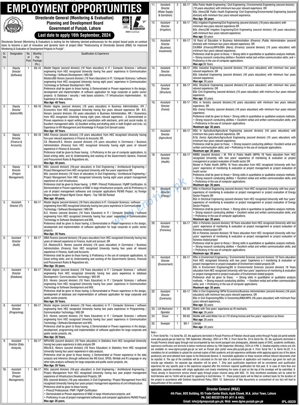 Director General Monitoring and Evaluation Jobs in Lahore announced in Express Newspaper dated 25-08-2024. The Monitoring and Evaluation Department of Punjab invited applications from interested candidates.