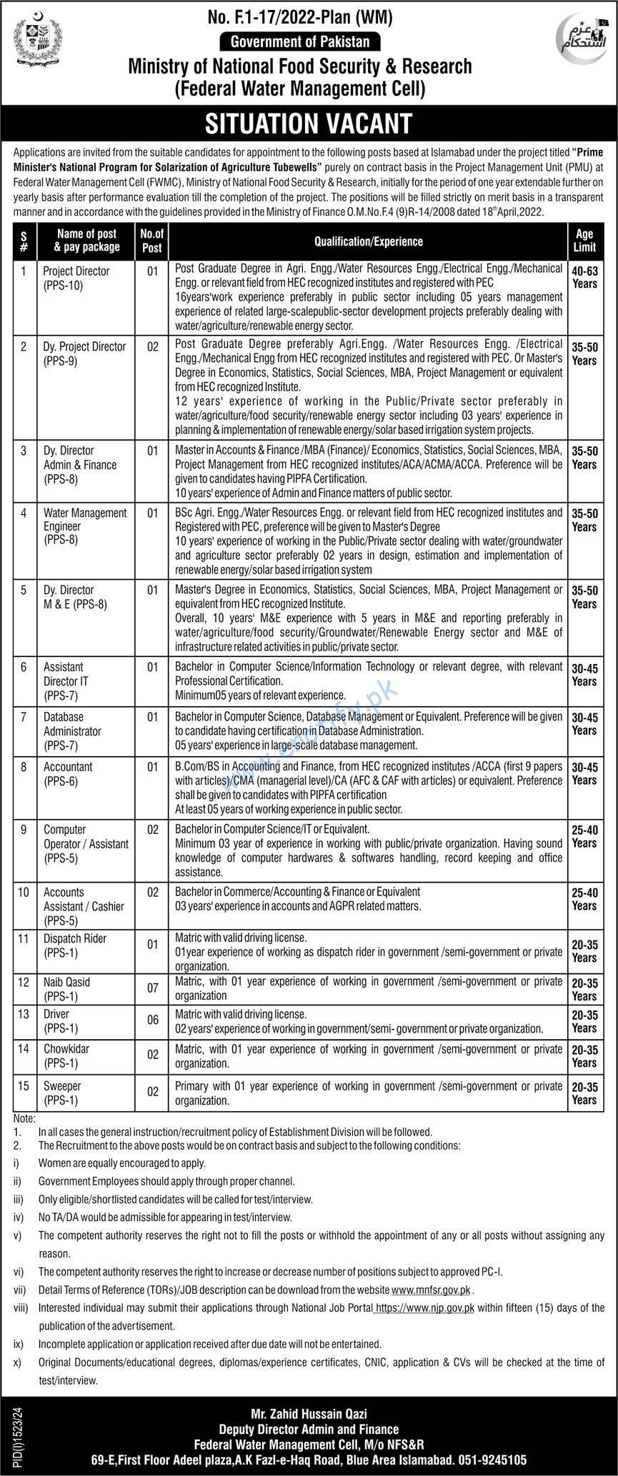 Applications are invited from suitable candidates for appointment to the following posts under the project titled “Prime Minister’s National Program for Solarization of Agriculture Tubewells” purely on a contract basis in the Project Management Unit (PMU) at Federal Water Management Cell (FWMC), Ministry of National Food Security & Research, initially for one year extendable further on yearly basis after performance evaluation till the completion of the project.