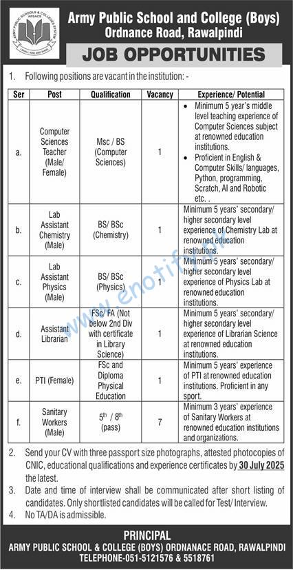 Job Opportunities at Army Public School and College (Boys), Rawalpindi – Apply by 30th July 2025. If you’re looking to advance your career in education or support services, here’s a fantastic opportunity! Army Public School and College (Boys), located on Ordnance Road, Rawalpindi, is inviting applications for several vacant positions in their esteemed institution.
